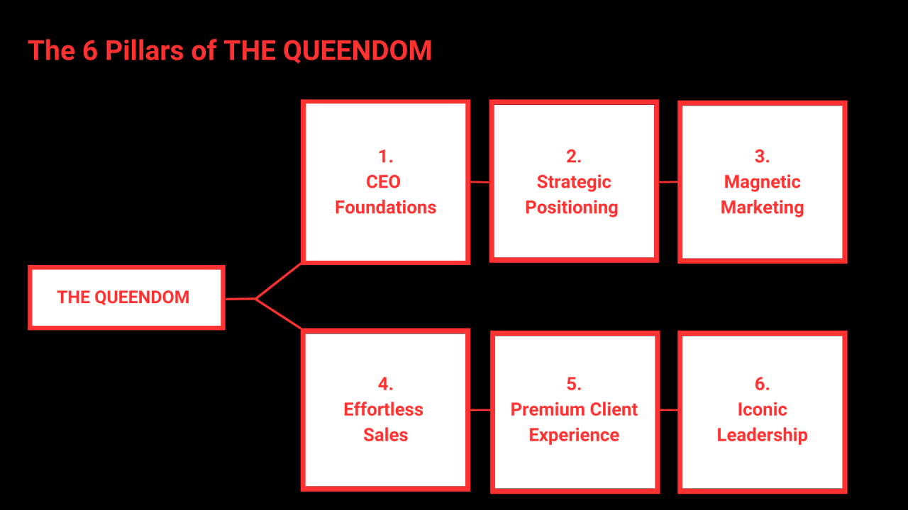 •My Lead Like A Queen Framework (6 powerful pillars for foundations, positioning, marketing, sales, client experience, and leadership).